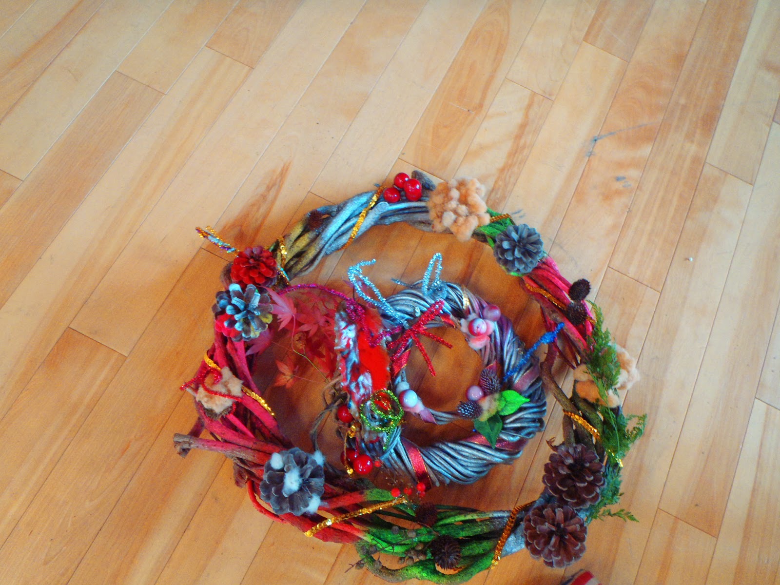 みんなのリースを並べて「ぜんぶかわいい」「あのきのみどこでひろったん?」