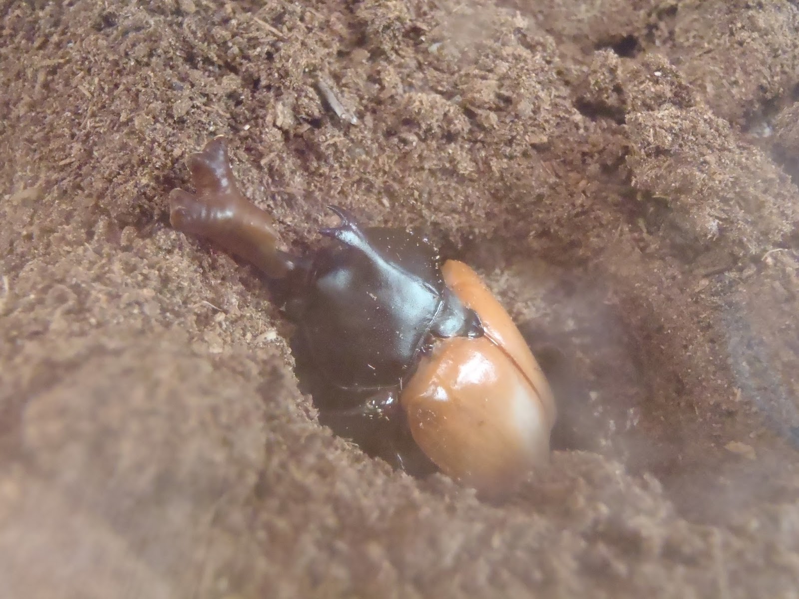 未だ成虫の虫かごへと移らないカブトムシが一匹。