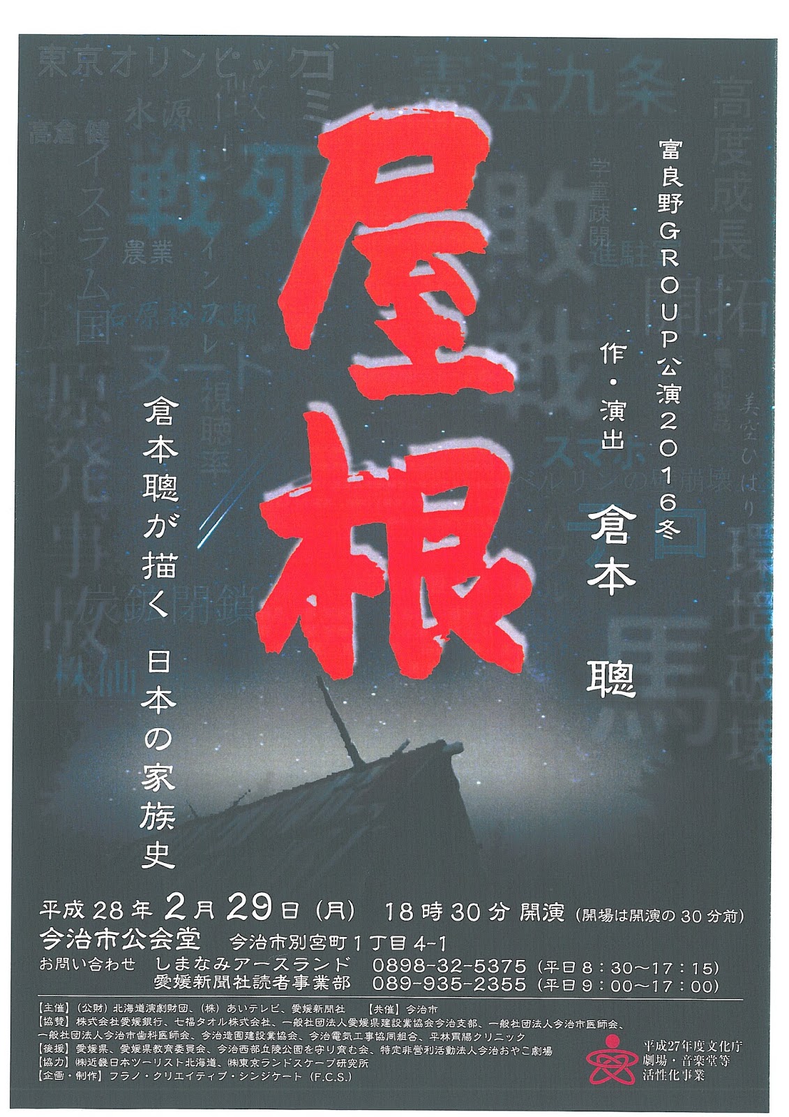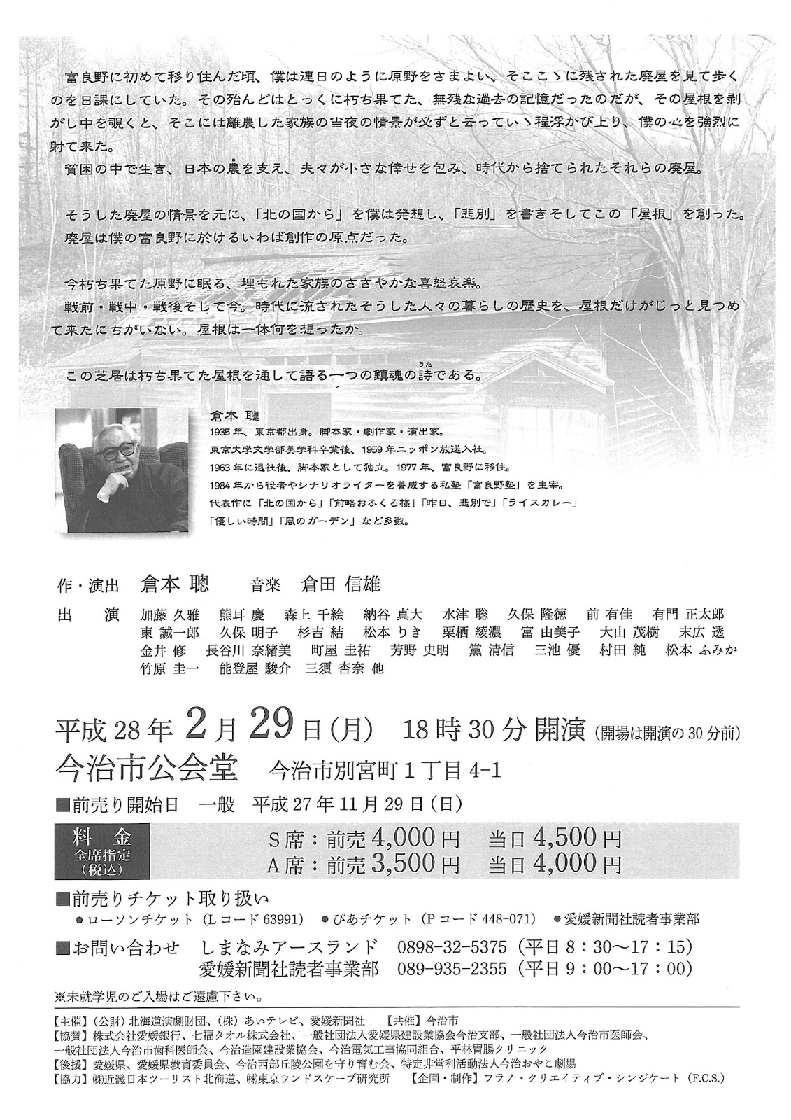 今治自然塾の監修元である富良野自然塾塾長の作家・倉本聰氏が主宰する富良野GROUPが、来年2月29日(月)今治市公会堂で「屋根」という劇を公演します。