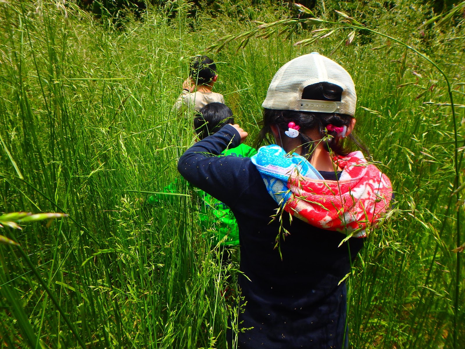 ジャンプして逃げようとするバッタをみんなで追いかけますが、なかなかつかまりません。