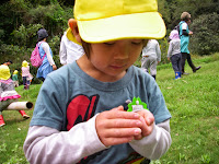 | うさぎのウンチの匂いを初体験! 「くさい」と言いながらもにっこり。 (草の香りがします) |